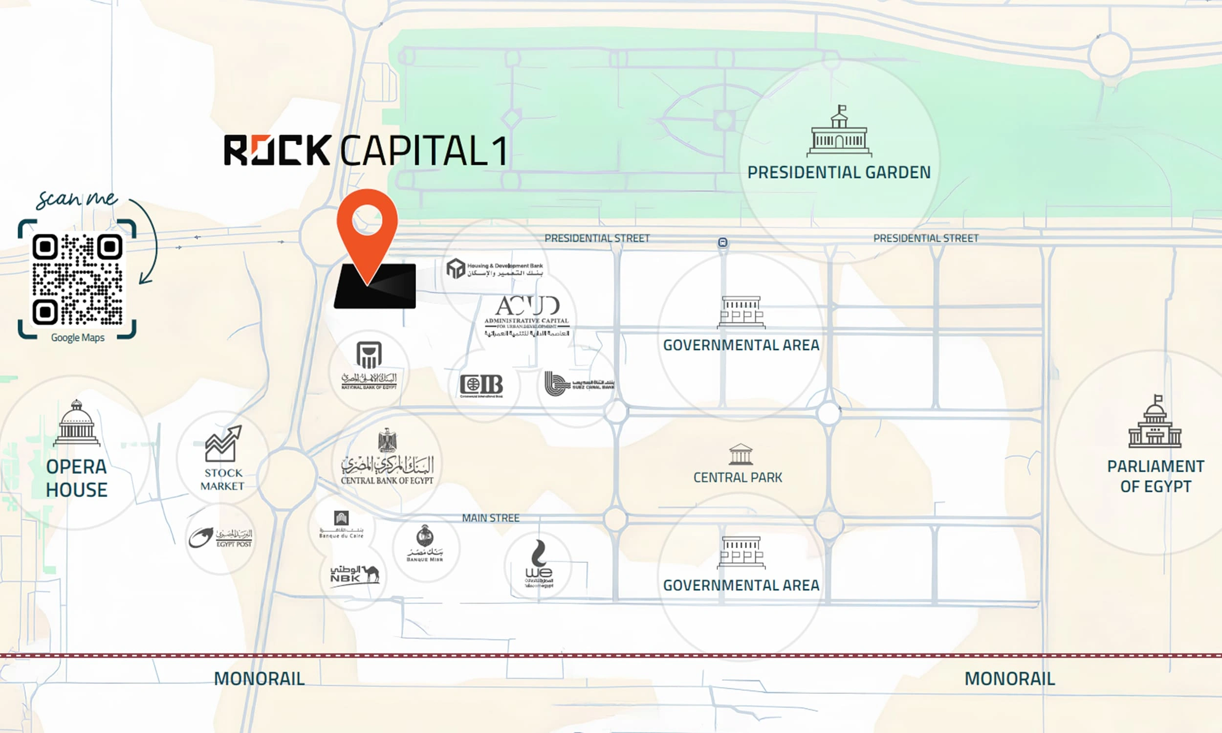 Rock Capital 1 is the greatest administrative project situated over 100,000 m² in the New Capital, with a luxury frontage of 200 meters on Presidential Road.